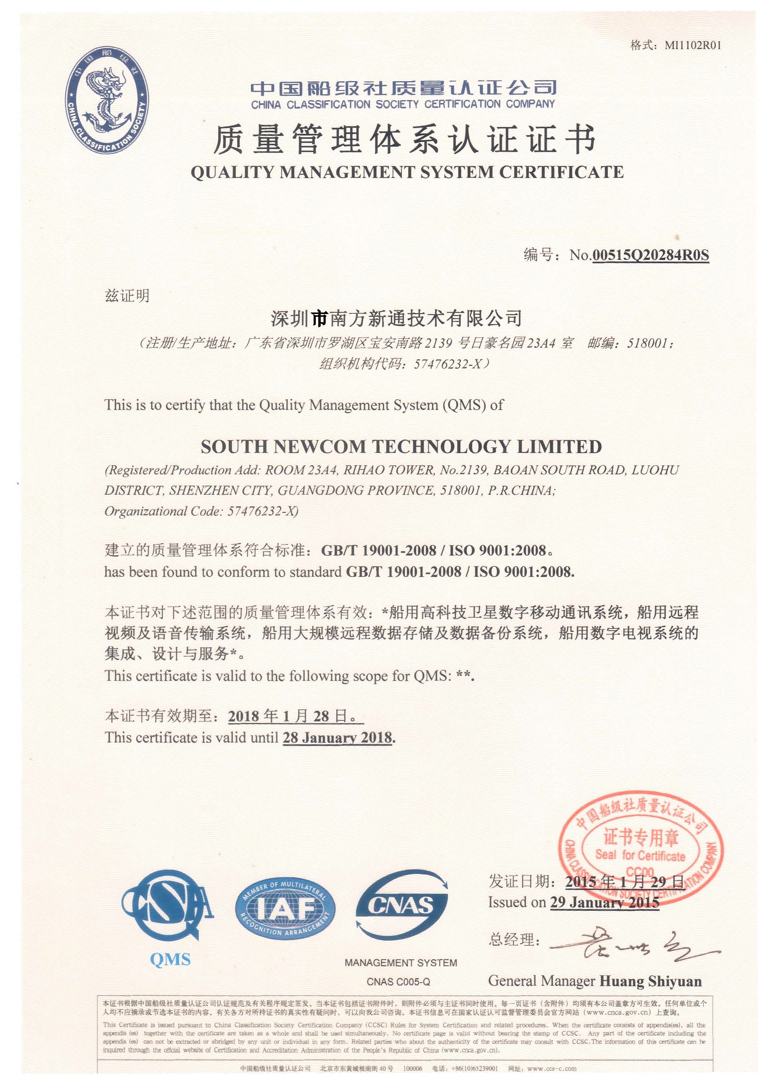 29th, Jan, 2015, SOUTH NEWCOM TECHNOLOGY (SNC TECH) gets the ISO9001:2008 Quality Management System Certification by China Classification Society Certification Company (CCSC).